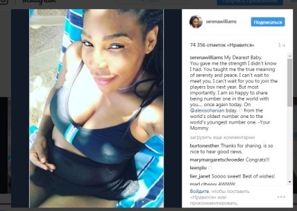 "Мой дорогой малыш, ты дал мне силу, о которой я и не знала. Ты научил меня истинному значению безмятежности и покоя. Не могу дождаться встречи с тобой. Не могу дождаться момента, когда ты присоединишься к моему "боксу" в следующем году. Но самое главное — я счастлива разделить с тобой звание первой в мире, снова. В день рождения Алексиса Оганяна. От самого возрастного первого номера самому молодому первому номеру. Твоя мама", — написала Уильямс-младшая на своей странице в сети "Инстаграм"
