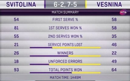 Первые четыре гейма в этом матче продолжались примерно полчаса. Веснина лидировала 2-1, но с четвертого брейкпоинта Свитолина сделала обратный брейк, а дальше до конца партии проиграла только два розыгрыша. Сет в итоге завершился за 42 минуты (11 виннеров на счету украинки при 5 невынужденных ошибках, Веснина отметилась 10 виннерами при 20 ошибках).