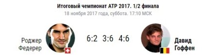 Итоговый турнир АТР 2017: все новостиПоединок продолжался 1 час 45 минут. Гоффен выполнил 7 эйсов, допустил 1 двойную ошибку и использовал 2 брейк-пойнта из 3. На счету Федерера 7 подач навылет, 3 двойные и 2 реализованных брейк-пойнта из 11. Кроме того, Гоффен 20 раз пробил навылет и совершил 27 невынужденных ошибок. У Федерера было 28 виннерсов и 37 неточностей.