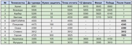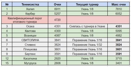 На данный момент это на руку Петре Квитовой и Каролин Возняцки, которые уже в Ухане могут досрочно гарантировать себе попадание на Итоговый турнир. Также в борьбу за попадание в топ-8 Чемпионской гонки могут вклиниться Дарья Касаткина и Гарбинье Мугуруса.