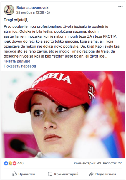 Бывшая тридцать вторая ракетка мира Бояна Йовановски приняла решение о завершении профессиональной карьеры. Об этом девушка заявила в своем Facebook.