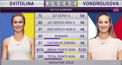 Теннисистки провели на корте 2 часа и 11 минут. В первом сете на два брейка соперницы Свитолина ответила одним. По ходу второй партии украинка дважды выходила вперед с брейком, но удержать отрыв не сумела. В десятом гейме Свитолина воспользовалась вторым сетболом на подаче чешки и перевела игру в решающую партию. Вондроушовой первой удалось сделать брейк, Свитолина ответила обратным брейком (3-3) и далее до конца встречи взяла 3 гейма из 4.