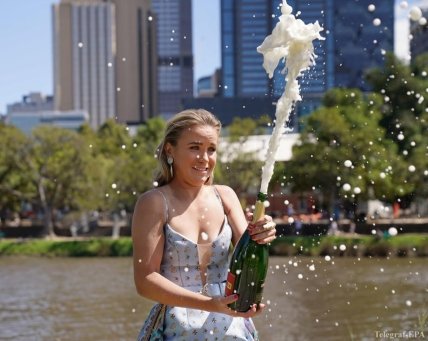 Вместе с трофеем, в роскошном платье она позировала перед камерами на фоне видов Мельбурна.