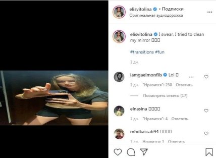 "Клянусь, я пыталась почистить зеркало": добавила комментарий к посту украинка, прикрепив видео, на котором она мгновенно меняет тренировочные шорты и футболку на юбку и каблуки. Действие происходит под песню Майкла Джексона Dangerous.