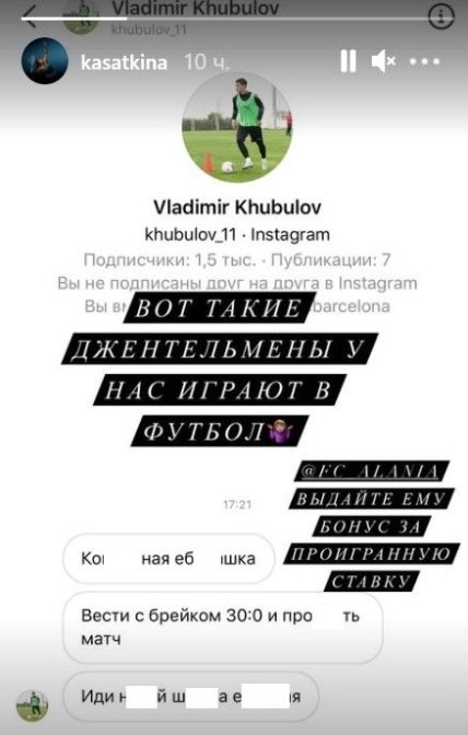 Украинскую теннисистку Ястремскую оправдали в деле о допингеКасаткина в трехсетовом триллере проиграла Остапенко в матче второго круга Турнира Большого Шлема со счетом 6:1, 3:6, 8:6 и нарвалась на гнев футболиста. Тот, видимо, сделал крупную ставку на победу россиянки и проиграл. После этого футболист зашел к теннисистке в директ и начал всячески оскорблять ее. Дарья на своей страничке в Instagram опубликовала переписку с игроком, а также посоветовала ФК "Алания" выдать бонус Хубулову за проигранную ставку.
