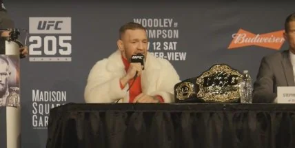 Чемпион UFC в полулёгком весе Конор Макгрегор "отличился" на пресс-конференции перед боем с чемпионом UFC в лёгком весе Эдди Альваресом, который состоится на турнире UFC 205, сообщает MirrorИрландец пришёл на пресс-конференцию в норковой шубе. Сперва он перенёс чемпионский пояс Альвареса, пока того не было, на то место, где сидел сам. А чуть погодя, когда между ним и Альваресом началась словесная перепалка, едва не запустил в соперника стулом. Сдержал ирландца президент UFC Дэна Уайт, находившийся рядом.