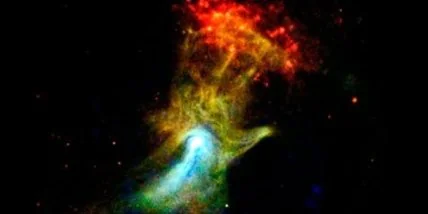 Специалисты NASA обнародовали снимки, сделанные телескопом орбитальной обсерватории. Туманность звезды PSR B1509-58 получила форму огромной руки, пальцы которой протягиваются к огням.