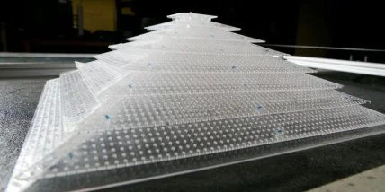 Первый в мире трехмерный акустический плащ-невидимка, разработанный профессором электронно-вычислительной техники из Университета Дьюка Стивеном Камером и его коллегами, состоит из нескольких листов перфорированного пластика с повторяющимися в определенном порядке отверстиями. Пластиковые листы, созданные с помощью 3D-принтера, наложены друг на друга для образования фигуры, напоминающей пирамиду.