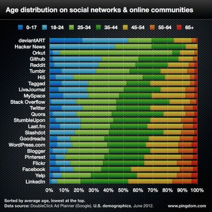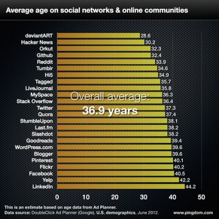 Также исследователи определили, что возрастной характер аудитории отличается для каждого социального сервиса. Так, молодой аудиторией может похвастаться сервис deviantART, где почти половину пользователей составляют люди в возрасте до 24-х годов. Как и ожидалось, "самая взрослая" аудитория в LinkedIn - здесь тинейджеров менее одного процента. Пользователи возрастной категории 35+ составляют 55% аудитории Twitter, 63% Pinterest и 65% Facebook. И наоборот, доля пользователей до 35 лет на "молодежных" сервисах составляет: Reddit - 58%, Github - 60%, Hacker News - 69%. Среднестатистический возраст пользователя социальных сетей составляет 37 лет. Если расположить сервисы по убыванию среднего возраста, то на первом месте окажется LinkedIn (44,2 года). Facebook по этому показателю находится на 3-м месте (40,5 лет), Twitter - на 13-м (37,3 года).