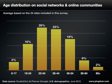 Исследование показало, что основная часть посетителей соцсетей - это люди в возрасте от 25 до 44 лет, а около 20% - это посетители в возрасте от 45 до 54 лет, причем доля таких пользователей больше, чем посетителей в возрасте 18-24 лет. Доля американских тинэйджеров среди пользователей социальных сетей составляет всего лишь 5%.