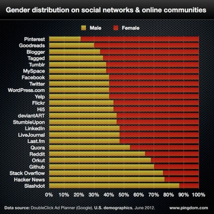 По процентному соотношению мужчин и женщин наиболее "женственными" оказались сайты Pinterest, Goodreads и Blogger, где их доля составляет 78%, 70% и 66% соответственно. На противоположной стороне рейтинга - уважаемые мужчинами Slashdot, Hacker News и Stack Overflow, здесь 87%, 77% и 76% пользователей этих сервисов соответственно представляют сильную половину человечества.
