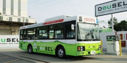 В городе Фудзисава, который находится в Японии в центре префектуры Канагава, начал ездить первый в мире автобус, работающий именно на этом топливе. Производитель грузовиков и автобусов Isuzu совместно с компанией Euglena создал топливо, состоящее на 1% из эвгленовых водорослей. На достигнутом компании не останавливаются и надеются к 2018 году придумать технологию, которая позволит без дополнительной нагрузки на двигатель использовать биотопливо, полученное на все 100% из водорослей.