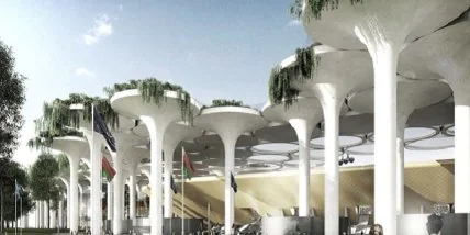 Чтобы не нарушать строительные стандарты по высоте, конструкция, из-за своих размеров, будет углублена в землю. Навес, выполненный в виде световых люков, также будет напоминает крышечки тракторных клапанов.