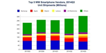 Поставки смартфонов на мировой рынок в III квартале 2014 года достигли нового рекорда, составив 327,6 аппаратов. Это на 8,7% больше в сравнении с 301,3 млн во II квартале 2014 г., по итогам которого объем рынка впервые превысил 300 млн устройств (295,3 млн, согласно предварительным результатам).