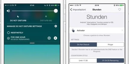С помощью твика из Cydia можно получить подобный функционал на iPhone. Stunden работает схожим образом и вызывается на экран при помощи действия Activator. На прозрачной панели находятся регулятор уровня громкости, разделы с и "Беспокоить" и переключатели "Постоянно", "На час". Пр помощи кнопок "+" и "-" можно настроить время от 15 минут до 8 часов, по прошествии которого режим "Не беспокоить" автоматически отключится.