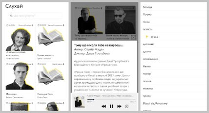В электронную библиотеку "Слухай" вошло более 100 прозаических и поэтических аудиокниг украинской классики и современности. Некоторые тексты зачитывали авторы лично. К озвучке присоединились теле- и радиоведущие, талантливые актеры театра и кино, музыканты. Войдя в это приложение, хочется остаться как можно дольше и с головой погрузиться в литературу.