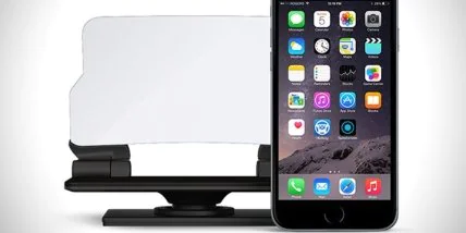 Затем было решено создать аксессуар, который обеспечил бы ту же функциональность даже при ярком дневном свете. Hudway Glass крепится к приборной панели прямо перед глазами водителя, на смартфон можно установить самые разные приложения для проекции дороги, GPS-навигации, отображения скорости и так далее.