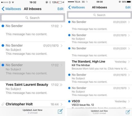 По словам читателей ресурса Reddit, почтовый сервер Apple не может прочитать корректно заголовки писем, для которых не указана дата отправления (или с неправильной временной зоной), в результате владельцы iPhone и iPad видят их как пустые электронные послания, датированные 1 января 1970 года или 31 декабря 1969 года.