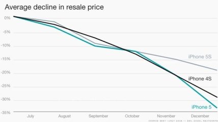 На иллюстрации к статье показано, какими темпами дешевели каждая из предыдущих моделей iPhone после презентации новых iPhone. Обратите внимание, каким резким было падение цен в августе – за месяц до анонса. Иллюстрацию подготовил реселлер "яблочной" техники NextWorth.