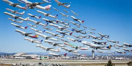 Самолет, взмывающий над взлетно-посадочной полосой аэропорта, — впечатляющее зрелище, но вряд ли этим кого-то удивишь. Сотни самолетов, взлетающих одновременно, — это уже гораздо интереснее. Фотограф из Лос-Анджелеса Майк Келли создал серию снимков Airportraits, и на это ему понадобилось два года. Он снимал вылетающие и прилетающие самолеты в 18 аэропортах мира. После этого он скомпилировал изображения, чтобы получить удивительные снимки. Они напоминают нам о том, насколько на самом деле загружено небо над городами.