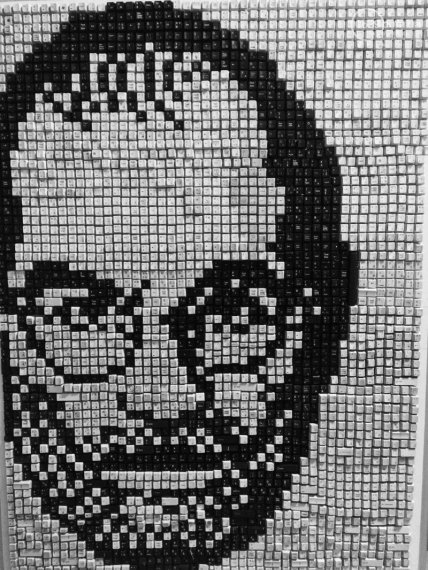 В картине зашифровали несколько слов: Apple, StevenJobs и iPhone. Vонтировали с помощью клеевого пистолета. Размер мозаики - 1 метр 37 см х 99 см. Сейчас портрет повесили в одной из аудиторий. Компания Аpple через соцсети узнала о необычной картине и сейчас хочет приобрести ее.