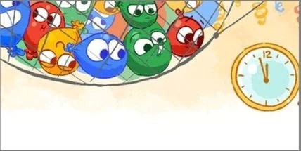 Гугл презентовал двигающуюся картинку, на которой нарисованы тематические часы с временем 23.55, и праздничные шарики, который так и поглядывают, когда же уже ровно в 00.00 они вырваться на свободу, чтобы поздравить всех и каждого с 2017 годом петуха.