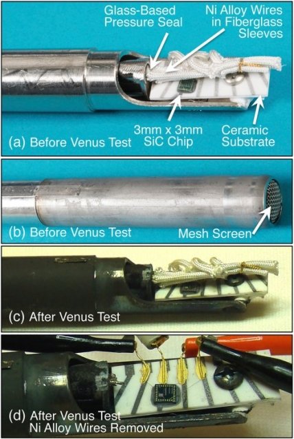 Как уже упоминалось выше, основными факторами, препятствующими длительной работе электроники на поверхности Венеры, являются высокая температура и огромное давление. Подавляющее большинство современных чипов изготавливаются из кремния, который при высокой температуре теряет полупроводниковые свойства и начинает вести себя, как простой проводящий материал. Заменой кремнию в высокотемпературных чипах стал карбид кремния, которые сохраняет полупроводниковые свойства при высокой температуре, кроме этого, в чипе использованы электрические проводники из экзотических материалов, к примеру, силицида тантала, которые могут выдержать не только высокую температуру, но и продолжать работать в химически агрессивной окружающей среде.