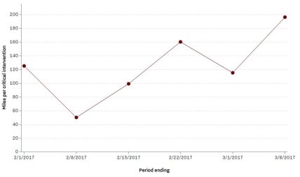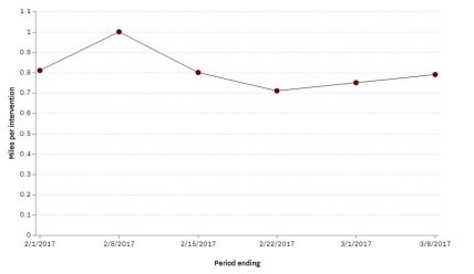 В течение второй недели марта пробег между значительными происшествиями составил около 315 километров, сообщается в отчете. Под такими случаями компания подразумевает экстренные ситуации, в которых водителю необходимо перехватить управление, чтобы избежать аварии стоимостью более пяти тысяч долларов и наезда на пешехода. За неделю до этого средний безаварийный пробег составил 183 километра, в конце февраля — 257 километров. Худший показатель был продемонстрирован на второй неделе января — 80 километров безаварийного пробега.