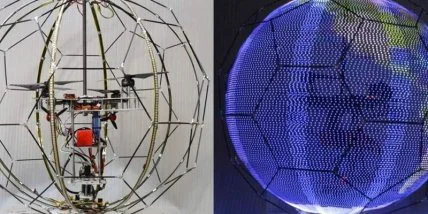 Японская компания Docomo разработала сферический светодиодный экран. Он имеет разрешение 144×136, но главная особенность — шарообразный дисплей способен летать. В Docomo заявили, что это первый аппарат в своем роде. Изображение транслируется прямо во время полета дрона, который встроен внутрь шарообразной конструкции.