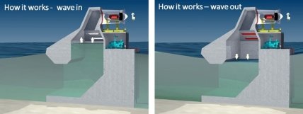 Установка компании построена по типу осциллирующей водяной колонны. Ее работа предусматривает два цикла. На первом этапе повышение уровня воды приводит к росту давления внутри подводной камеры, которое частично стабилизируется с помощью специальных клапанов. При отступлении воды клапаны закрываются, а в камере, за счет снижения уровня воды, возникает пониженное давление. Попадающий снаружи воздух при этом приводит в движение однонаправленную турбину, которая совмещена с электрогенератором.