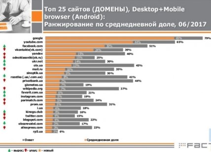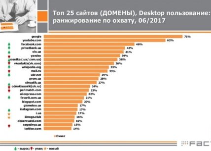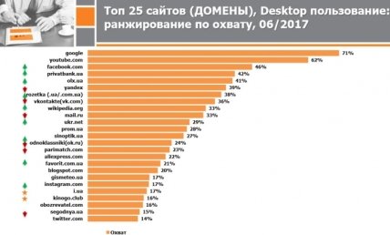 "По итогам июня, впервые на третье место вышел Facebook с ежемесячным охватом 46%. ВКонтакте, Одноклассники, Мейл.ру, Яндекс существенно потеряли аудиторию. Впервые за всю историю исследований, в ТОП-5 сайтов, которыми пользуются украинцы, нет российских проектов", - пишет Watcher.