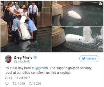В одном из торговых центров США робот-охранник въехал в открытый фонтан и утонул. Робот был разработан компанией Knightscope, которая сообщает, что подобные боты разрабатываются для обеспечения дополнительной безопасности. Они могут записывать видео и передавать его в режиме онлайн-трансляции службе безопасности.