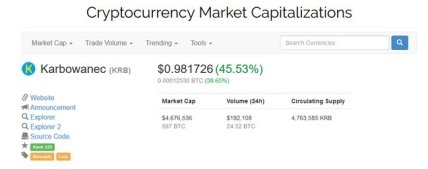 Еще в марте текущего года за один Karbowanec давали 0,4 грн, а сегодня его стоимость превысила $1 по данным CoinMarketCap.
