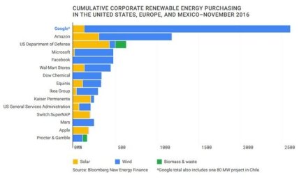 «Плюс 535 МВт увеличили общий объем энергии, потребляемой Google в мире, до 3 ГВт — 2*98 МВт с Avangrid в Южной Дакоте, 200 МВт с EDF в Айове и 138,6 МВт с GRDA в Оклахоме, что утверждает Google как крупнейшего корпоративного покупателя возобновляемой энергии на планете и 100% потребляющего возобновляемую энергию уже в 2017 году», — пишет он.