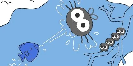 "Мы сегодня на соревнованиях по биатлону на воде, иначе это называется „плюю-и-плыву“. Лучшей в этом виде спорта является рыбка-брызгун", — шутят создатели дудла.