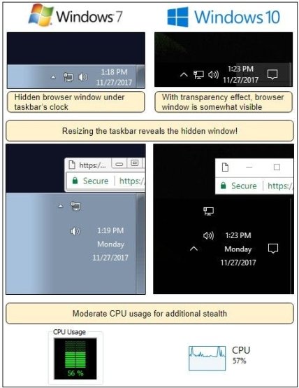 Новый метод заключается в том, что скрипт запускается во всплывающем окне, которое прячется под панелью задач Windows, в месте где находятся часы. Это очень простой и хитрый трюк, но на первый взгляд его довольно трудно заметить. Результатом применения такого метода является то, что даже после того, как пользователь закроет браузер, в фоне еще работает процесс, связанный со скрытым окном. Именно в нем работает скрипт майнера. Malwarebytes обращает внимание на то, что если в Windows 10 у нас включена прозрачность, то при соответствующем фоне рабочего стола, скрытое окно может быть немного видно.