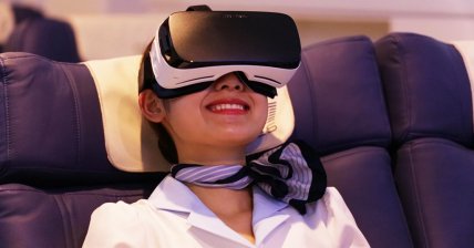 Через десятки экранов транслируется вид якобы с лобового стекла самолета. А пассажирам дают очки виртуальной реальности, в них они видят путешествие по разным городам.