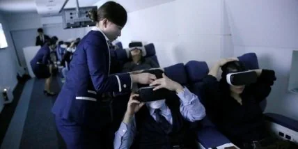 Через десятки экранов транслируется вид якобы с лобового стекла самолета. А пассажирам дают очки виртуальной реальности, в них они видят путешествие по разным городам.