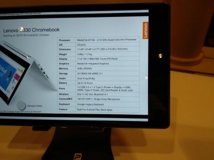 Кроме продуктов линейки Yoga, компания представила и Lenovo Chromebook. Устройства S330 и C330 появятся в продаже в некоторых странах уже в ноябре по цене €279 и €349 соответственно. Диагональ экрана C330 составит 10 дюймов. Ему обещают до 10 часов автономной работы.
