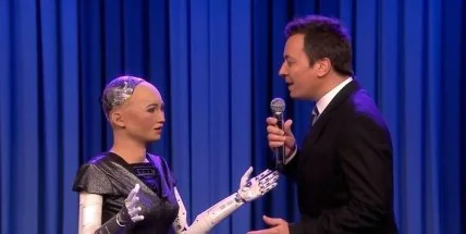 Пожалуй, дуэт робота Софии и Джимми Фэлона - самый необычный в истории телевидения. Ведущий американского вечернего шоу Джимми Фэллон сделал выпуск про самых удивительных роботов со всего мира. Изюминкой программы стала антропоморфный робот София, которая продемонстрировала свой новый навык - пение. Вместе с Фэллоном они спели песню Say Something Кристины Агилеры. Робот София - разработка гонгконгской компании Hanson Robotics. Она умеет говорить с людьми, давать интервью и выражать 60 мимических реакций. Она выступала в ООН, на конференциях по всему миру, а в 2017 году ей дали гражданство Саудовской Аравии. Софией управляет искусственный интеллект, разработанный компанией SingularityNET. Робот постоянно обучается и совершенствует свои коммуникативные навыки.