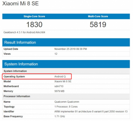 Энтузиасты обнаружили в популярном бенчмарке Geekbench упоминания об Xiaomi Mi8 SE на Android Q. Стоит отметить, что смартфон был выпущен в начале года с Android 8.1 Oreo, а обновление до Android 9.0 Pie он до сих пор не получил.