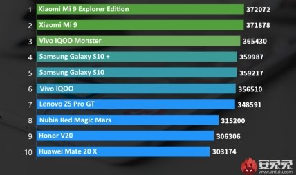 Третье место в рейтинге получила топовая модификация игрового смартфона Vivo IQOO (Monster) с 12 ГБ ОЗУ. Устройство также работает на флагманском чипе Snapdragon 855, но при это набирает меньше баллов, чем смартфоны Xiaomi — 365 430. На четвертом и пятом месте разместились Galaxy S10+ и Galaxy S10 (359 987 и 359 217). Далее по списку идёт обычный Vivo IQOO (356 510), Lenovo Z5 Pro GT (348 591) и Nubia Red Magic Mars (315 200). Ну а замыкают его смартфоны Honor V20 (306 306) и Huawei Mate 20 X (309 174).