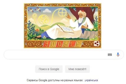 Перед нами персидский ковер в котором вышит логотип Google внизу. На основном месте расположен Омар Хаям. Он сидит под деревом и читает большую книгу. В одной руке он держит гроздь винограда, а другой рукой чертит в воздухе геометрические фигуры. Также рядом с фигурой можно видеть нашу планету и солнце над которыми пролетают две птицы. Интересно, эти птицы изображены случайно или с каким-то смыслом. Но к этому рисунку нет комментария разработчика, чтобы это узнать.