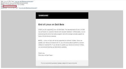 Samsung разослала всем участникам тестирования Linux on DeX письма, в которых сообщила о прекращении бета-тестирования приложения. Устройства под управлением Android 10 больше не будут поддерживать это ПО.