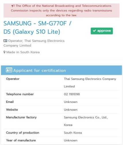 Смартфон Galaxy S10 Lite с номером SM-G770F сертифицирован NBTC в Таиланде. Документы еще раз подтверждают название модели и то, что устройство использует версию Global Dual SIM.