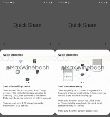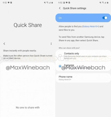 Специалисты XDA запустили приложение на смартфоне Samsung Galaxy Note 10+ и Galaxy S10+, но передать файл между устройствами не получилось. Тем не менее, они выяснили, что Quick Share будет работать так же, как и другие технологии обмена данными — только со смартфонами поблизости. Ещё сервис позволит выгружать временно файлы в облако Samsung Cloud, чтобы потом отправить их на другие «умные» устройства Samsung. Например, на смарт-телевизор.