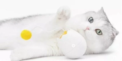 Сделана игрушка в виде разбитого куриного яйца с желтком, только из него торчит пушистый помпон. Именно он и должен развлекать кота, вращаясь на 360 градусов. Само яйцо напоминает неваляшку, то есть игрушка не перевернется, если животное ударит его лапами.