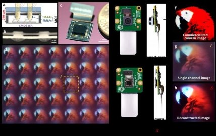 Ультратонкая камера, созданная с использованием биологической технологии, имеет инвертированные массивы микролинз (iMLA), многослойные апертурные матрицы (MAA), разделители промежутков и матрицы датчиков изображения CMOS (CMOS ISA). . Здесь изображено также поперечное оптическое изображение iMLA и MAAs. c захваченным массивом изображений красного попугая. Справа фотографии коммерчески доступной компактной камеры (вверху) и ультратонкой камеры (внизу) для сравнения характеристик изображения с сопоставимым объективом с f-числом. Изображение красного попугая, полученное коммерциализированной камерой и одним каналом ультратонкой матрицы камеры, а также восстановленное изображение из нескольких каналов.