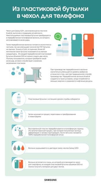 «Такие переработанные материалы помогают решать проблему переработки пластика. Создание волокон из пластиковых бутылок — это экологически чистый процесс, который происходит без участия тяжёлой машинерии, тем самым способствуя сохранению невозобновляемых источников энергии», — отмечают в Samsung.
