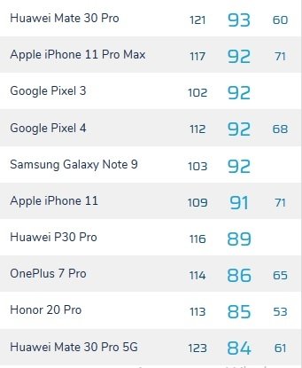 В результате Huawei Mate 30 Pro 5G занял лишь 17 место в рейтинге после P30 Pro, iPhone 11 и еще 14 устройств.